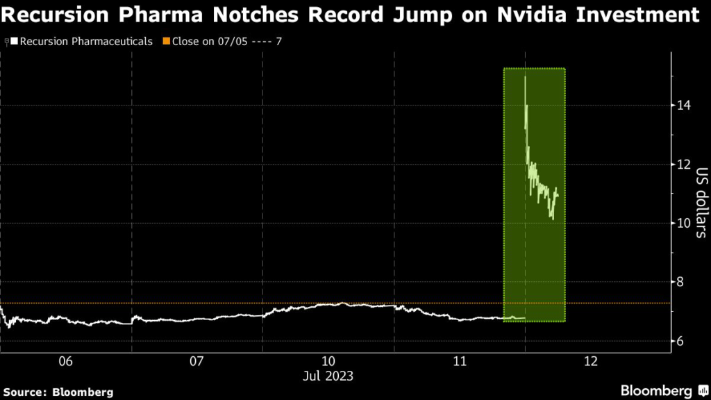 A $50 million private investment from the AI-linked chipmaker sparked a surge in Recursion, which uses machine learning to discover new medicines. The stock more than doubled at the market open before ending Wednesday with a record 78% gain.
