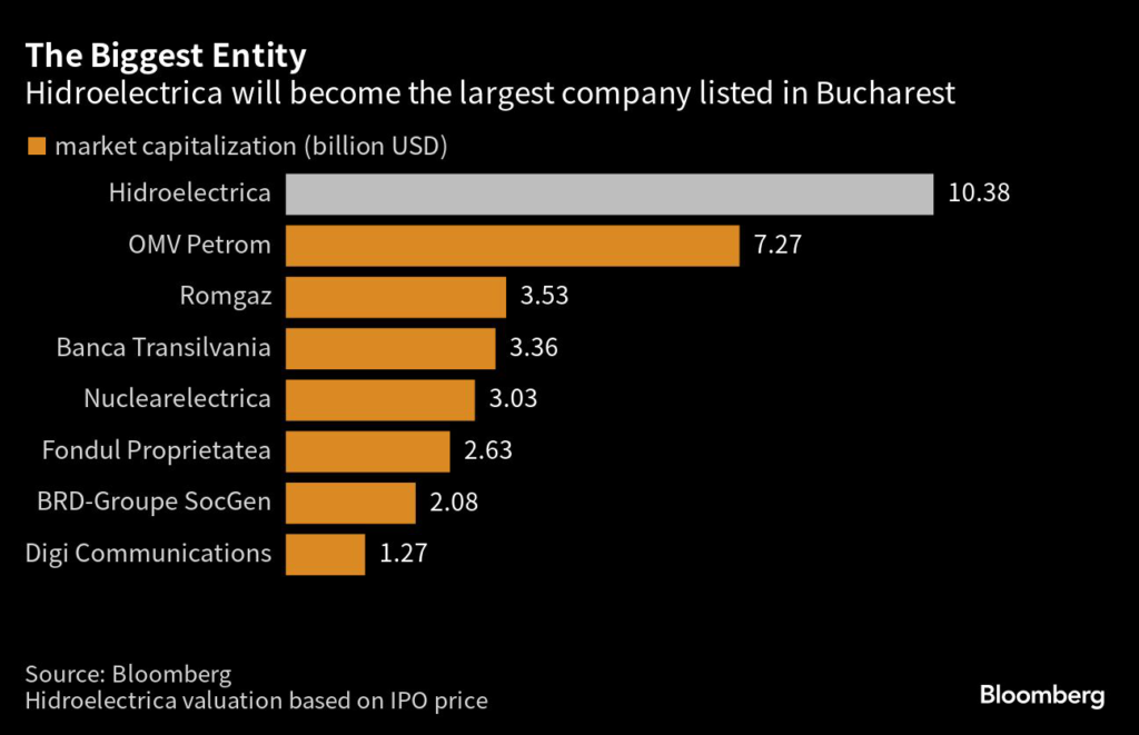 The renewable power producer immediately became Romania’s biggest listed company, worth more than $10 billion, and the ticket for the local bourse to ditch its frontier status and graduate to an emerging market at MSCI.