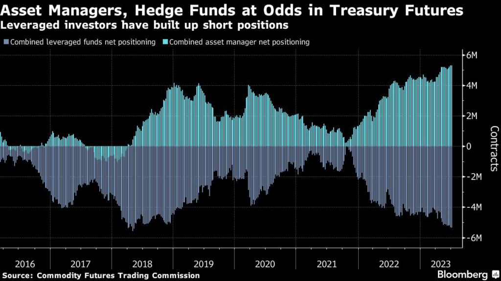 Treasuries positioning since then suggests leveraged traders have kept adding to their basis trade bets, in part facilitated by asset managers who’ve piled into the other side of the wager to hedge their interest-rate exposure.