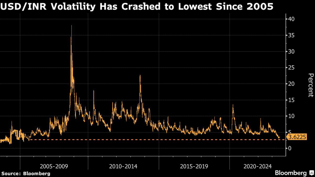 (Bloomberg) — Even in a year where currency volatility is falling worldwide, the slump in swings in the Indian rupee has traders from London to Singapore asking when the central bank will loosen its iron grip.