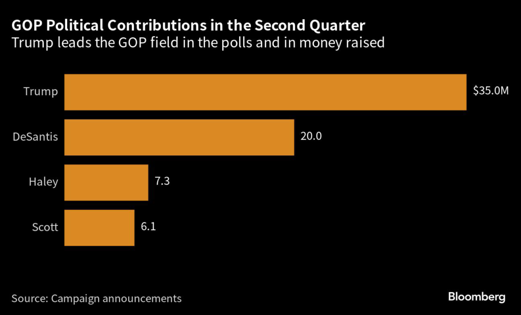 Former President Donald Trump raised $9.5 million in the first six weeks of his campaign, and in the most recent quarter, garnered $35 million more. Florida Governor Ron DeSantis raised $20 million in his initial 38 days.