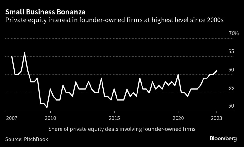 Even by that measure, though, purchases of founder-owned businesses — which in most cases are valued at under $100 million apiece — are on the rise. They accounted for more than 43% of deal value in the first quarter of 2023, well above the typical levels in recent years, according to PitchBook.