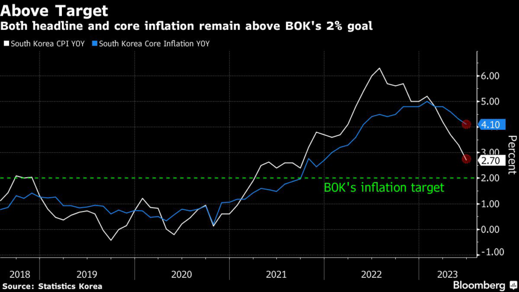 (Bloomberg) — The Bank of Korea stuck resolutely to its hawkish stance of holding interest rates while warning of the possibility of more hikes to come as it battles to rein in consumer inflation without derailing the economy.