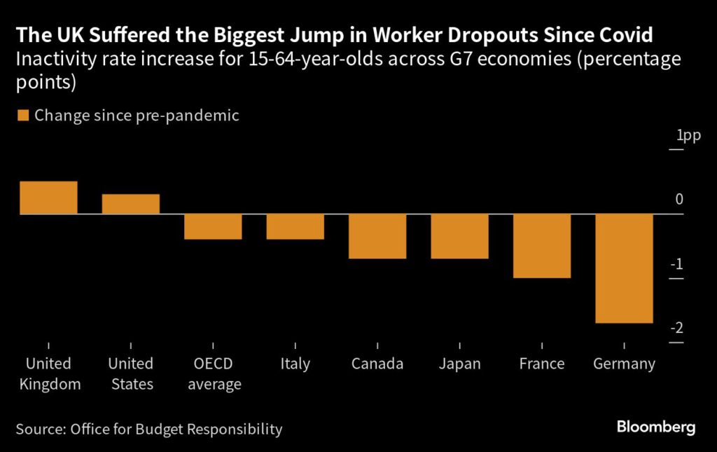Britain’s increase in economic inactivity — where people are out of work and not looking for a job — is unique among Group of Seven economies.