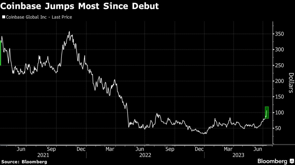 The stock surge was the most since Coinbase jumped 31% at its debut on the Nasdaq in April 2021.