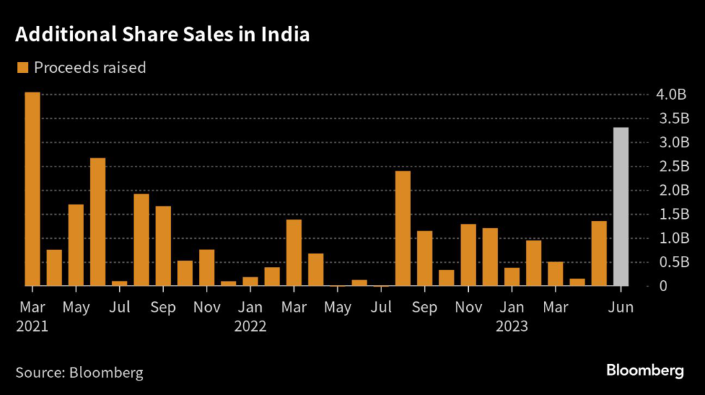 Additional share sales priced in the South Asia country in June amounted $3.3 billion, the highest tally for a month since March 2021, Bloomberg-compiled data show.
