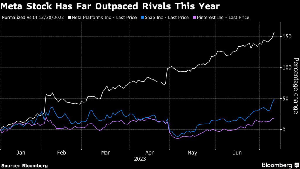 Facebook parent Meta is by far the dominant player in the sector, and that is extending to its stock this year. Shares have outperformed by leaps and bounds, with the rapid user growth of Threads the latest demonstration of a reach and scale that has made it a favorite among investors and analysts.