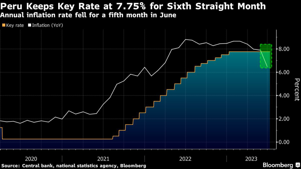 (Bloomberg) — Peru held interest rates at a 22-year high on Thursday as policymakers wait for more evidence that inflation is slowing decisively toward its target.