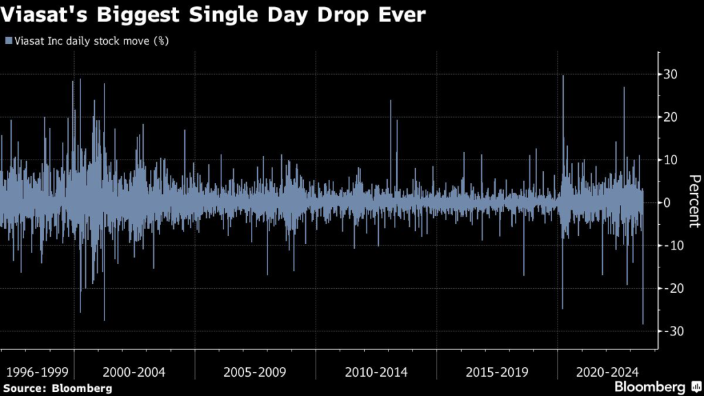 Viasat Inc. slumped a record 28% Thursday after announcing an unexpected event that threatened the performance of a key communication satellite.