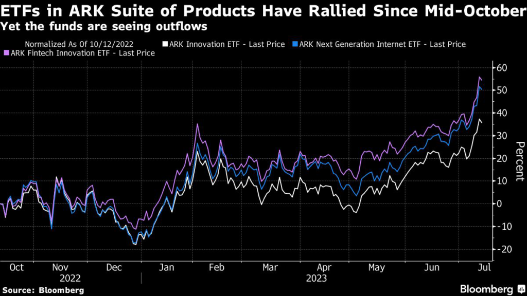 (Bloomberg) — Cathie Wood fans, after years of steadfastness, have gone AWOL, with her suite of exchange-traded funds seeing outflows in recent months despite all of them posting impressive rallies.