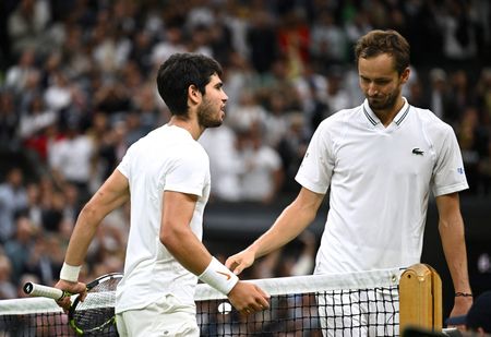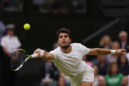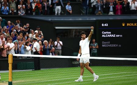 LONDON (Reuters) -Spain’s Carlos Alcaraz delivered the Wimbledon final the world wants to see with a brutal, and at times breathtaking, demolition job on unfortunate Russian Daniil Medvedev on Friday, roaring to a 6-3 6-3 6-3 victory.