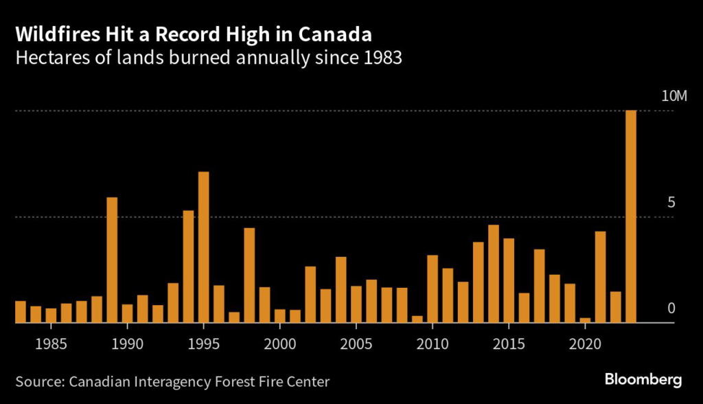 (Bloomberg) — Canadian wildfires have scorched more than 10 million hectares (25 million acres) this summer, an area about the size of Iceland, with no end to the burning expected anytime soon.