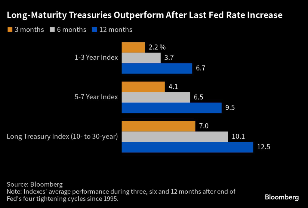 On average, Treasuries maturing in 10 or more years have gained 10% in the six months after a Fed policy-rate peak, compared with 6.5% for bonds maturing between five and seven years and 3.7% for those due within three years, according to data compiled by Bloomberg.