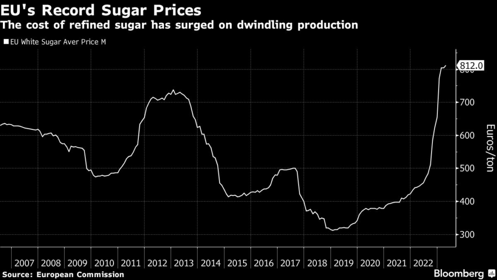 Sugar production for the current 2022-23 season fell 12% relative to the previous one, and at 14.6 million tons, was one million tons below initial EU estimates. While large companies — and in turn, consumers — were shielded from big price hikes thanks to long-term contracts, prices in the spot market have surged 58% since last October, squeezing smaller and medium-sized confectioneries.