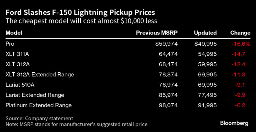 (Bloomberg) — Ford Motor Co. is slashing prices on the electric version of its best-selling F-150 pickup by as much as 17%, as it moves to fend off new competition coming from Tesla Inc.