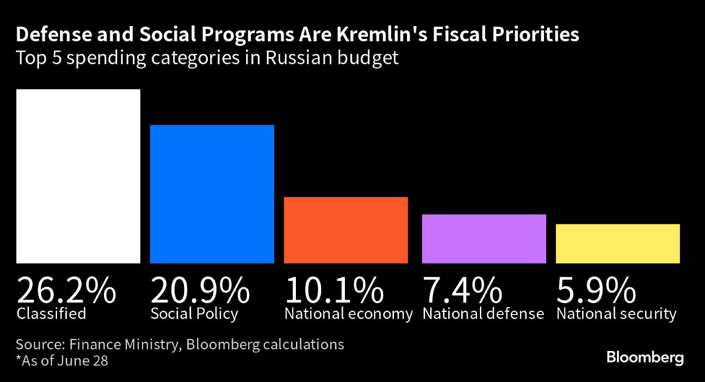 The changing calculus caused by the rebellion will end up swelling what are already some of the biggest-ticket items in a budget that ran a deficit of 2.6 trillion rubles in the first half of 2023, or more than three-quarters of the total targeted by the government for the entire year.