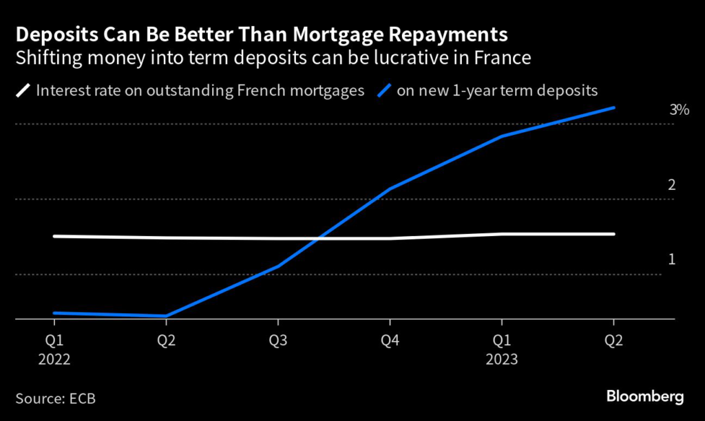 For those with spare cash, putting money into savings rather than paying off cheap loans makes sense. Savers in France earn an average of more than 3% on one-year term bank deposits and 2.6% in Germany.