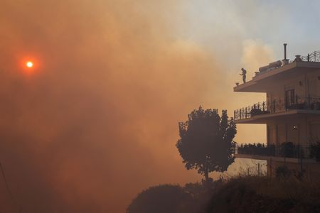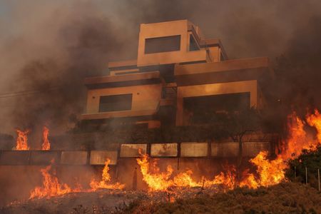 KOUVARAS, Greece (Reuters) -Two wildfires, fanned by strong winds, raged uncontrolled through coastal towns near Athens on Monday forcing residents to flee their homes and prompting the evacuation of hundreds of children from a summer camp.