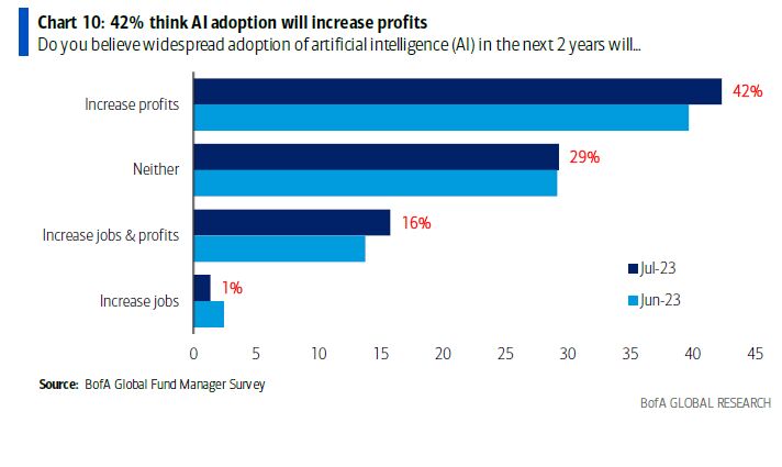 Being long big tech stocks topped the list of most crowded trades, while 42% of polled fund managers say AI will increase profits over the next two years.