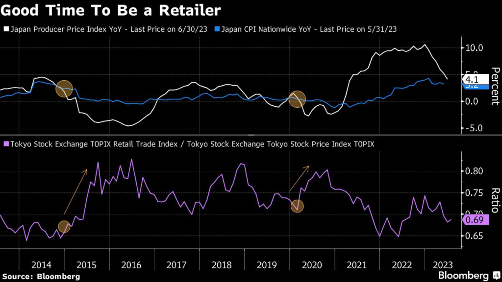 Wholesale price inflation, a proxy of cost increases for retailers, “looks set to fall below consumer price inflation within a couple of months,” and when that happens, retailer stocks tend to outperform, he said.