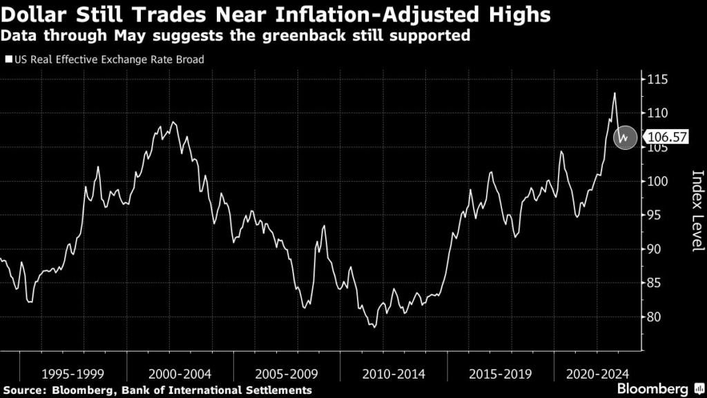 Meanwhile, the US currency is trading near historical highs on an inflation-adjusted basis through May, according to the latest data from the Bank of International settlements.