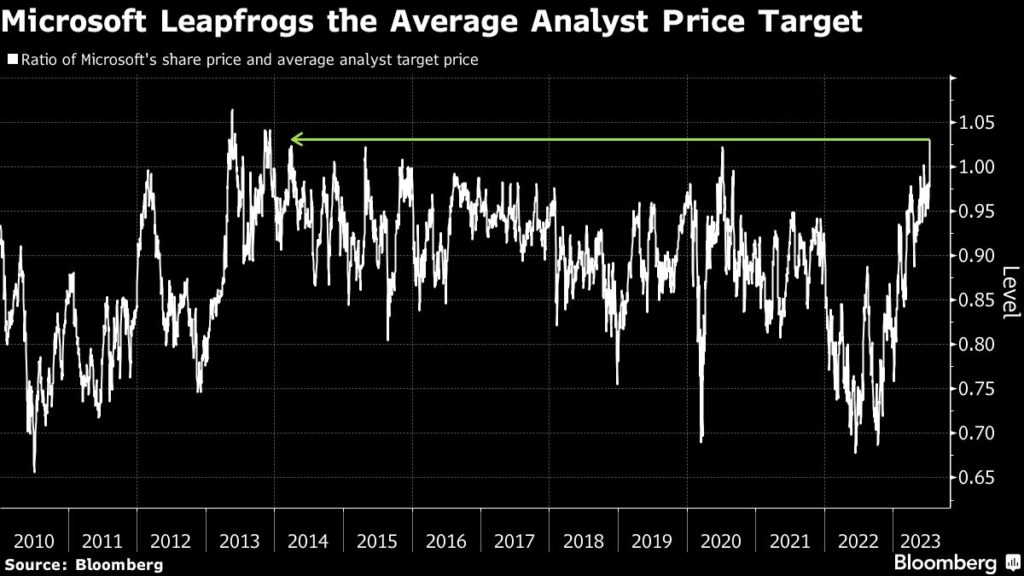 The advance drove the stock to $364.44 — 3% above the average analyst price target of $353.60. That’s the most Microsoft has been above it since 2013, according to data compiled by Bloomberg.