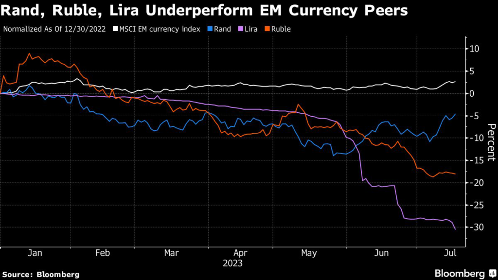 The Turkish lira has lost about 30% of its value against the dollar this year, while Russia’s ruble is down 19% and South Africa’s rand 5%. That contrasts with a 2.3% gain in MSCI’s emerging-market currency gauge.