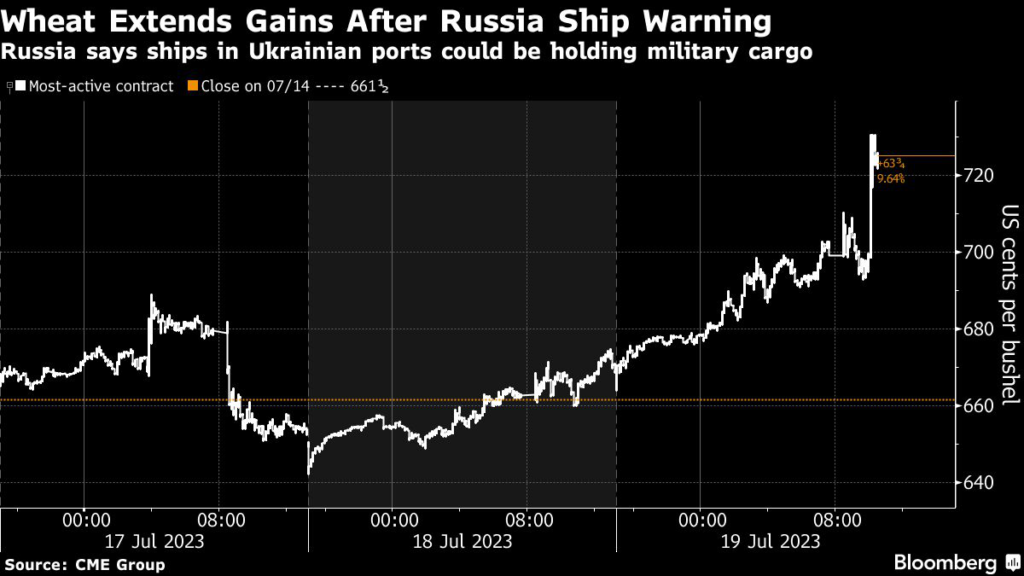 (Bloomberg) — Wheat futures soared as much as 9%, the biggest jump since 2012, as Russia threatened ships sailing to Ukrainian ports, escalating a conflict over exports from the key Black Sea region.