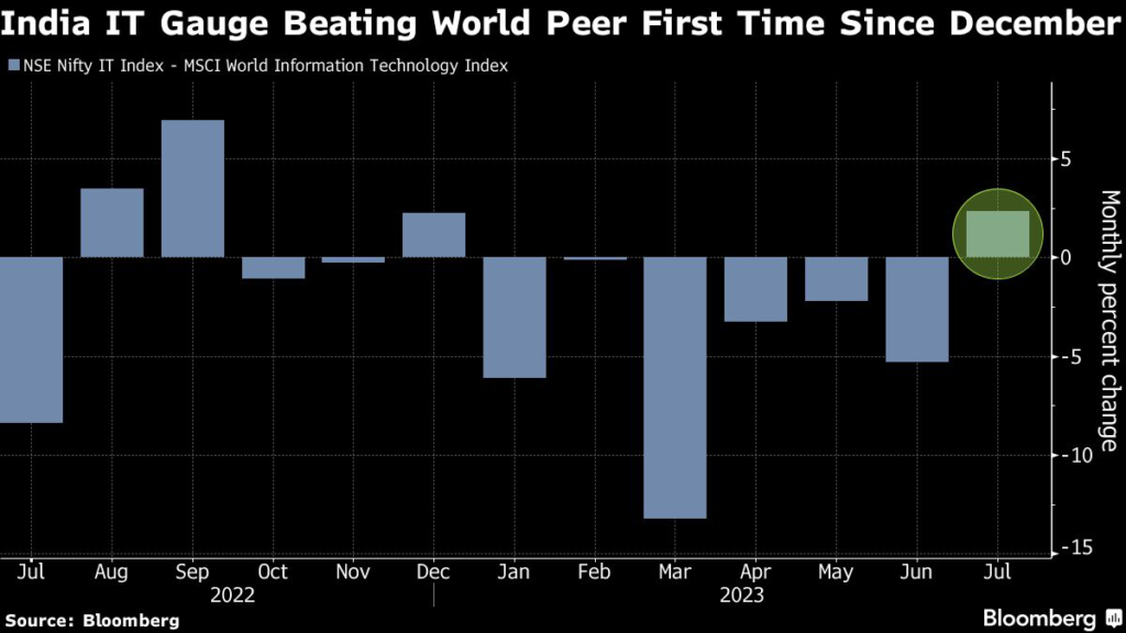 The 10-member gauge has turned the rally up a notch in July, and is on track to outperform the MSCI World Information Technology Index for the first time in seven months. Gains picked up after Asia’s biggest software services exporter Tata Consultancy Services Ltd.
