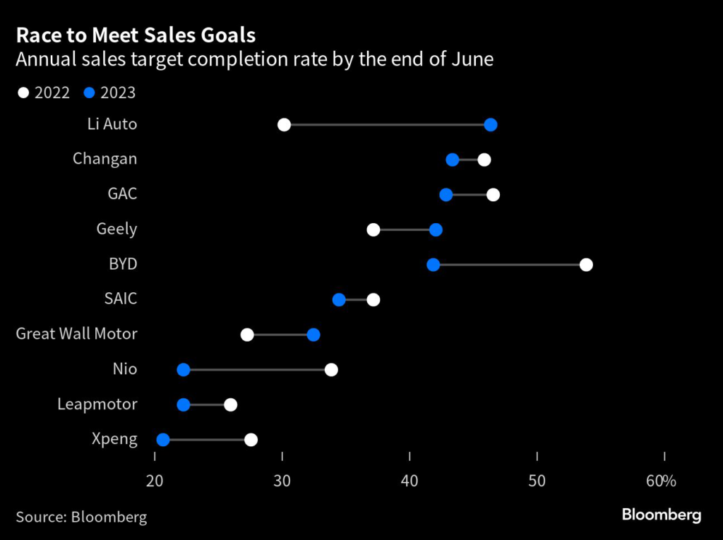 Li Auto Inc. was best placed, but only hit 46% of its target by the end of June. Top-selling brand BYD Co. got to 42% after more than doubling its 2023 objective to 3 million vehicles.