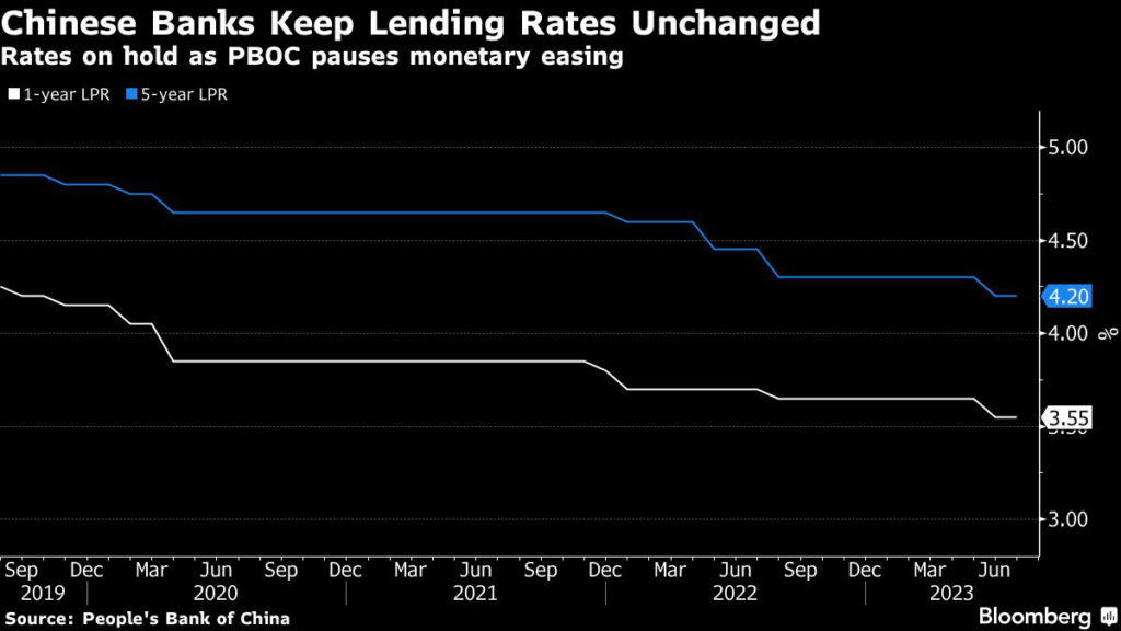 (Bloomberg) — Chinese banks kept their benchmark lending rates unchanged on Thursday, in line with the central bank’s move earlier this week as policymakers assess the economy’s recovery.