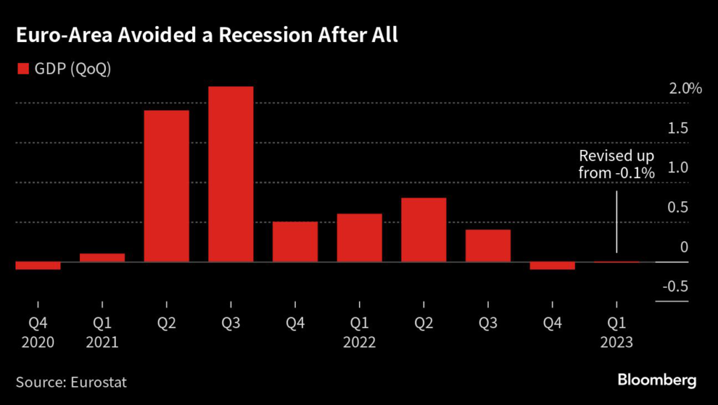 (Bloomberg) — The euro-area economy avoided a winter recession after all, with revised data showing it stagnated at the start of this year instead of shrinking as previously thought.