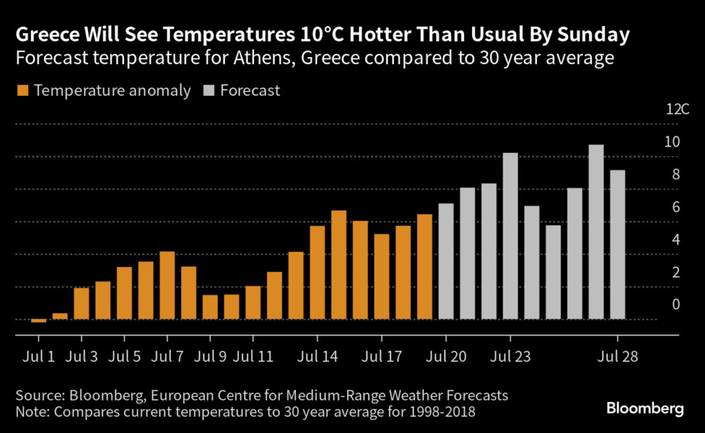 (Bloomberg) — Extreme heat across the Mediterranean is expected to build into the weekend, testing records in fire-ravaged Greece after easing slightly on Thursday.