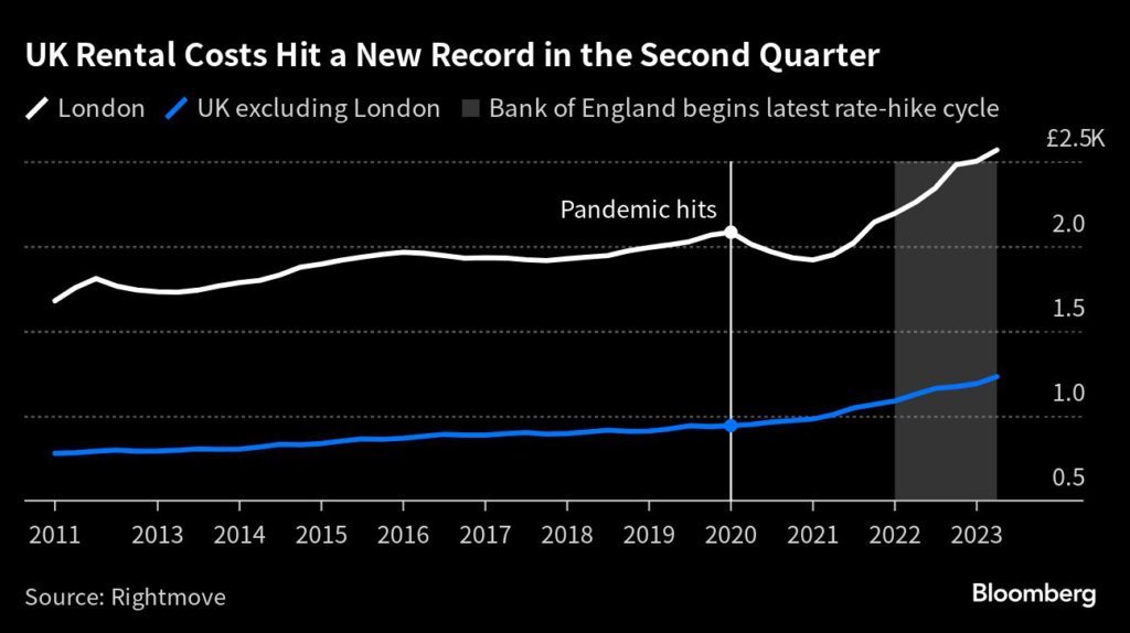 (Bloomberg) — Average asking rents for new tenants in London shot up to a new record in the second quarter as rampant demand and higher mortgage rates prompted landlords to hike prices.