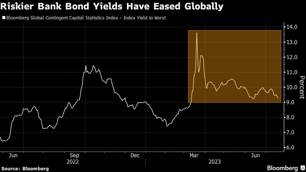 The average yield on the riskier bank bonds globally, including yen notes, is about 9.3%, down from a year-to-date high of 13.6% after the collapse of Credit Suisse, a Bloomberg index shows.