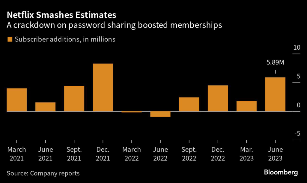 The company credited much of the boom to its crackdown on password sharing. In May, the streaming leader started charging people in more than 100 countries to continue sharing their passwords, a key part of its plan to accelerate growth after a sluggish 2022.
