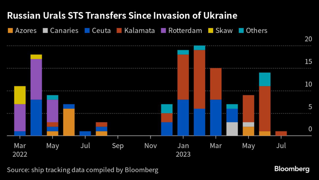 (Bloomberg) — The transfer of Russia’s flagship Urals oil at sea — a key part of the nation’s petroleum supply chain since the war in Ukraine — has all but ground to a halt.