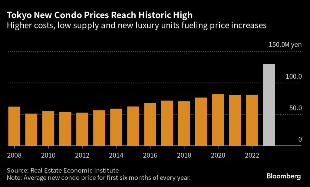 Newly built condo prices in Tokyo surged to a record in the first six months of 2023, adding fuel to a trend of growth stemming from factors including an influx of luxury units.