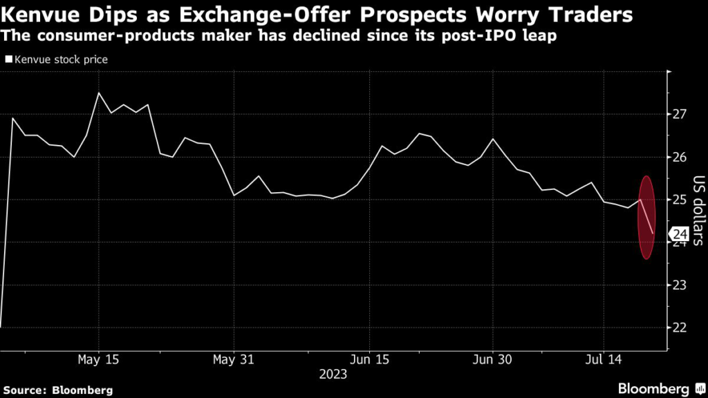 (Bloomberg) — Kenvue Inc., the consumer-focused spinoff of Johnson & Johnson that owns brands such as Band-Aid and Tylenol, fell on Thursday after J&J said it’s preparing to launch an exchange offer for its majority stake.