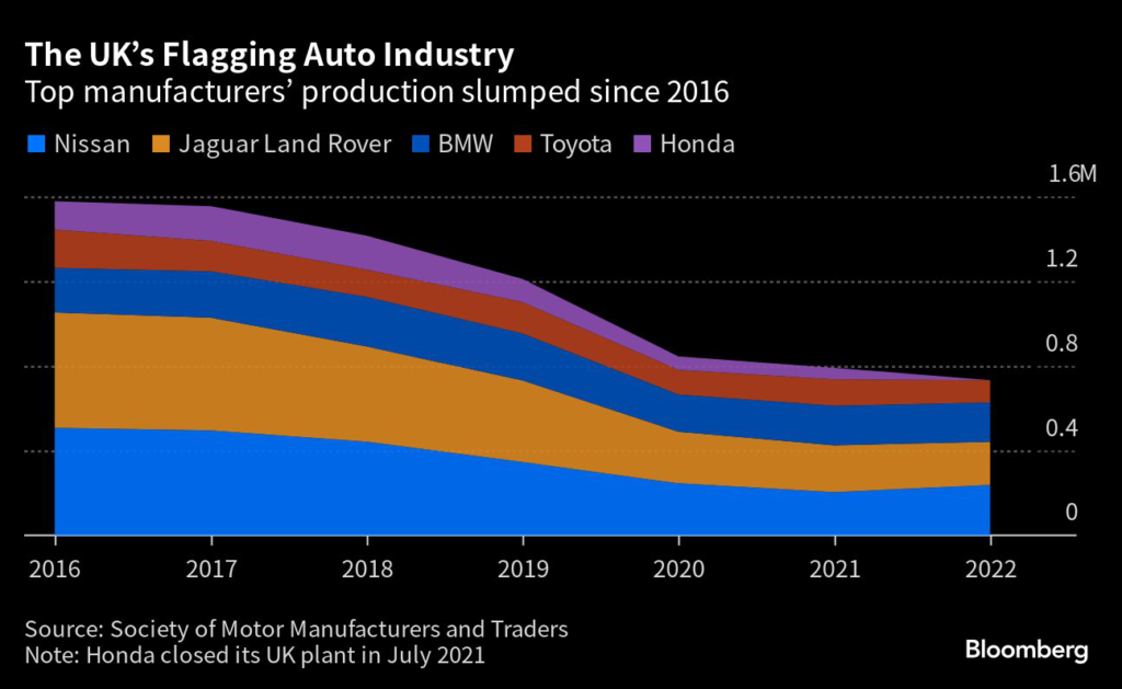 (Bloomberg) — Britain’s car industry has been on the decline for some time, with production falling to a 66-year low last year and rival governments pledging vast amounts of public funds to the development of electric vehicles.