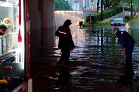 BEIJING (Reuters) – Several Chinese cities including Shanghai and Beijing braced for flooding on Friday while inland regions baked in heat threatening to shrink the country’s biggest freshwater lake.