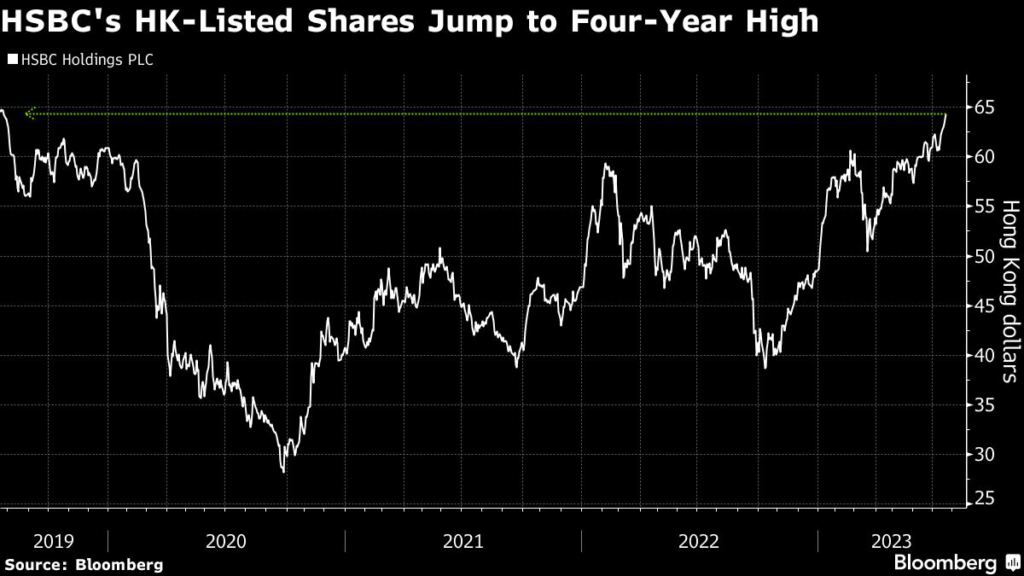 (Bloomberg) — A 32% rally this year has catapulted HSBC Holdings Plc’s shares to their highest level in four years, with improving margins potentially providing further support for the stock.