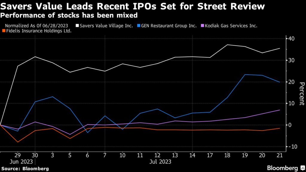and Fidelis Insurance Holdings Ltd. as well as GEN Restaurant Group Inc., owner of GEN Korean BBQ. The group has had bright spots — Gen Restaurant is up 20% from a June 29 debut — and underwhelming performances — Kodiak Gas is higher by 7% and Fidelis is down 1.5%.