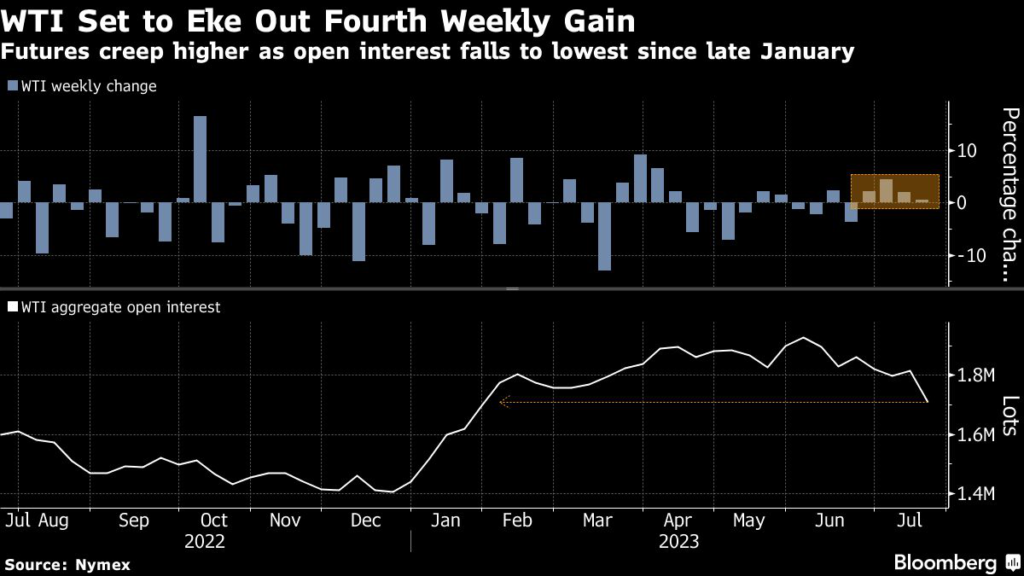 (Bloomberg) — Oil posted a fourth weekly gain amid lower summer trading volumes and tentative signs that global markets are tightening.