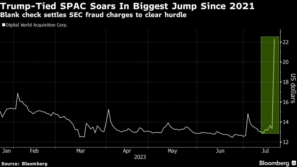 Digital World Acquisition Corp., the SPAC merging with Trump Media, jumped 93% in its biggest intraday advance since October 2021 after settling allegations it filed documents that were “materially false.” The settlement with the SEC comes weeks after Digital World said it had reached a preliminary agreement which would result in it paying an $18 million fine if the deal is completed.