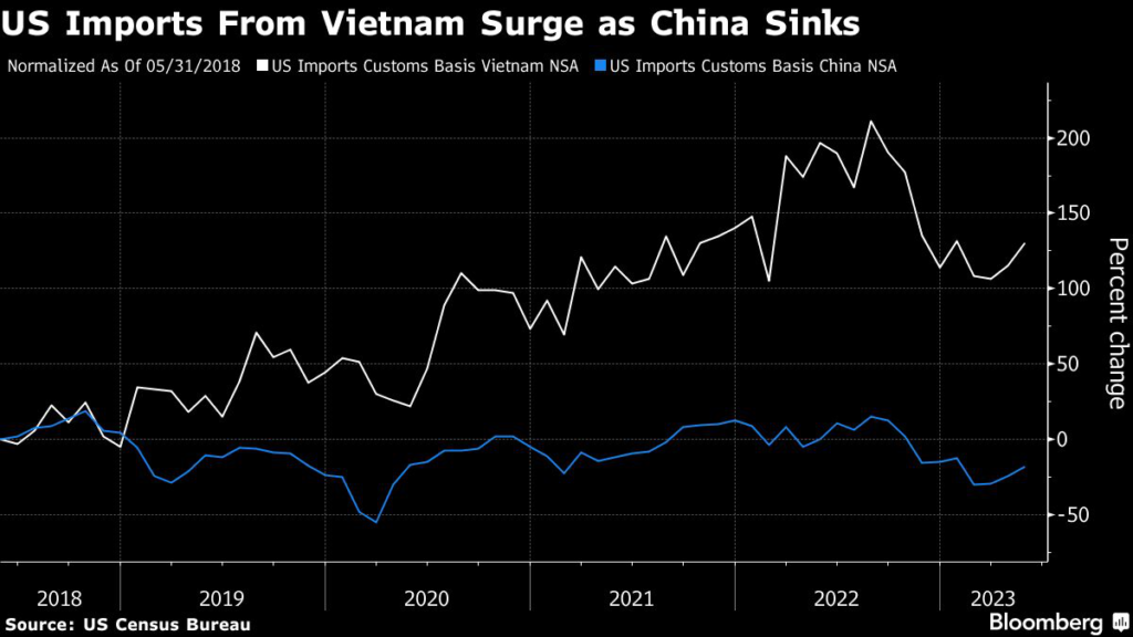 and a host of Apple Inc. suppliers, including Foxconn Technology Group, have flocked to the nation. US imports from Vietnam nearly tripled, to $127 billion, in 2022 from four years before — a period in which shipments from China slightly fell, to $536 billion.