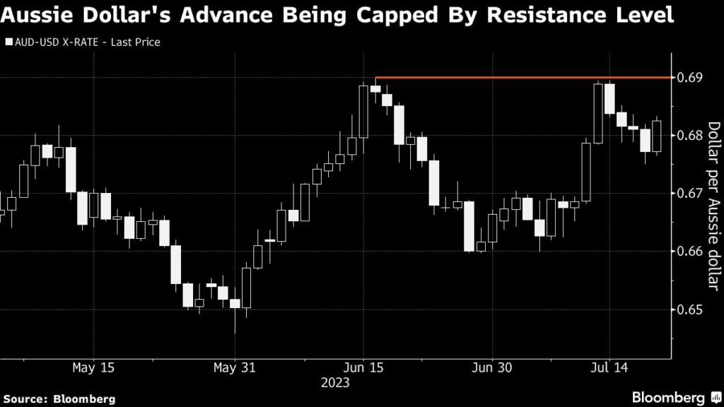 June inflation data due Wednesday may help determine the Aussie’s near-term outlook. A Bloomberg survey of economists predicts that consumer-price gains eased to 6.3% in the second quarter from 7% in the previous three months on an annual basis, which is likely to undercut the case for more rate hikes.