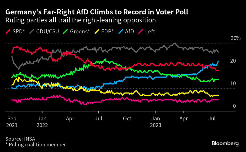 (Bloomberg) — Support for the far-right Alternative for Germany climbed to a record, widening its lead over all three parties in Chancellor Olaf Scholz’s ruling coalition.