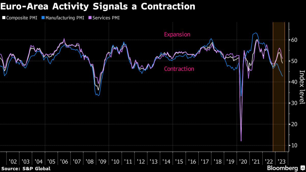 PMI data earlier on Monday showed the euro area’s top two economies — Germany and France — in contraction.