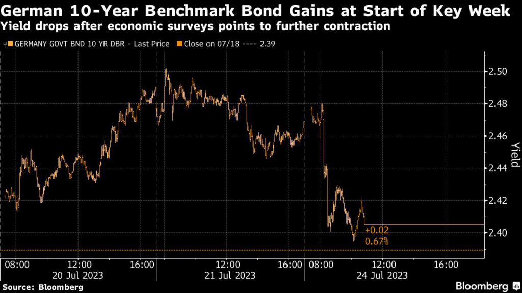 (Bloomberg) — Europe’s government bonds surged and the euro weakened after fresh warning signs over the health of the region’s economy, just days before the central bank is expected to deliver another interest-rate hike.